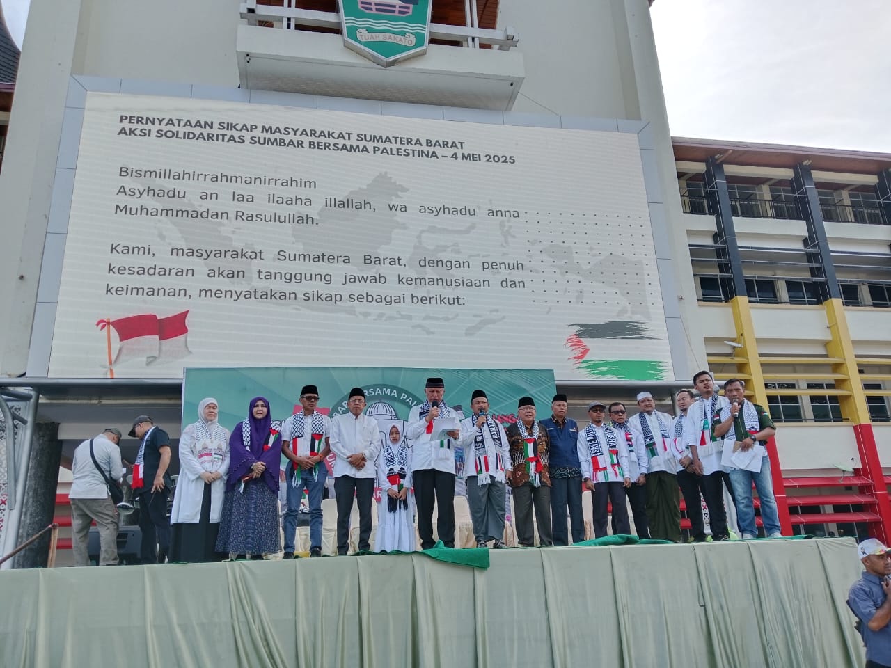 Salah satu tokoh yang turut hadir adalah Senator DPD RI asal Sumbar, H. Muslim M. Yatim. Dalam orasinya, Buya Muslim menegaskan pentingnya konsistensi umat Islam, khususnya di Indonesia, dalam mendukung perjuangan Palestina.