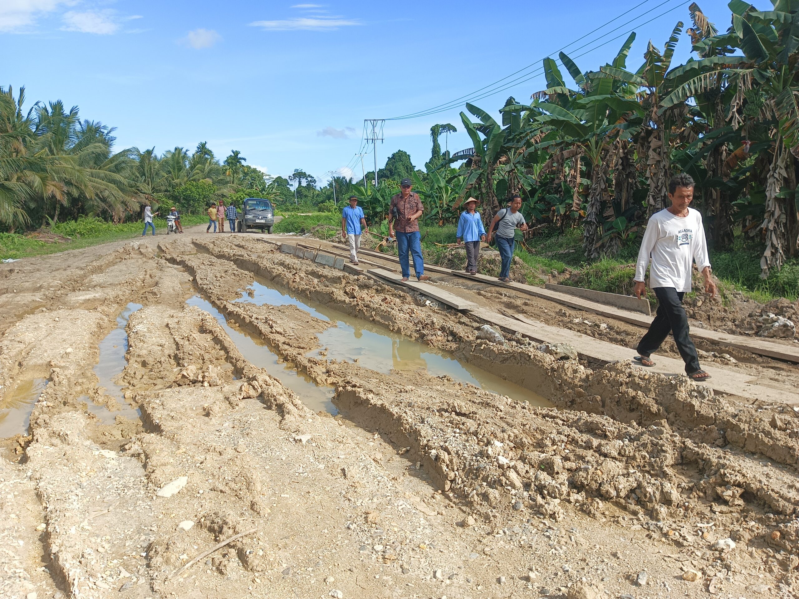 Badan Jalan yang terlihat hanya ditimbun dengan pasir bercampur batu napal seadanya. Badan jalan berlubang dimana-mana. Akibatnya jalanan menjadi becek, licin berlumpur serta sulit dilalui kendaraan bermotor.