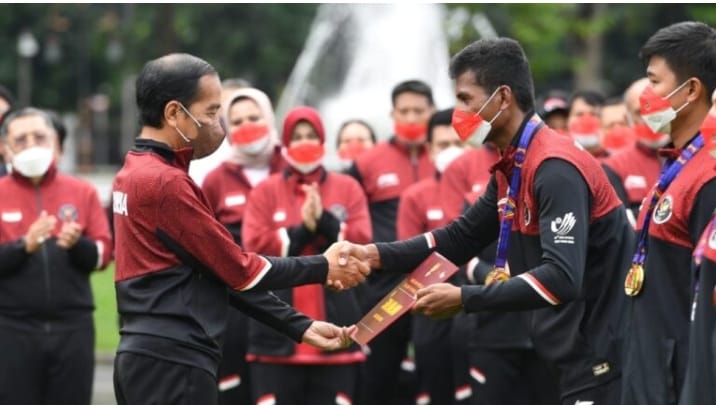 HARIANHALUAN.ID – Presiden Joko Widodo menerima sekaligus memberikan bonus dan apresiasi kepada para atlet SEA Games ke-31 Vietnam, di halaman depan Istana Merdeka, Jakarta, pada Senin (13/14/22). Presiden Jokowi mengaku bangga atas raihan medali yang berhasil dibawa pulang oleh para atlet ke Tanah Air.