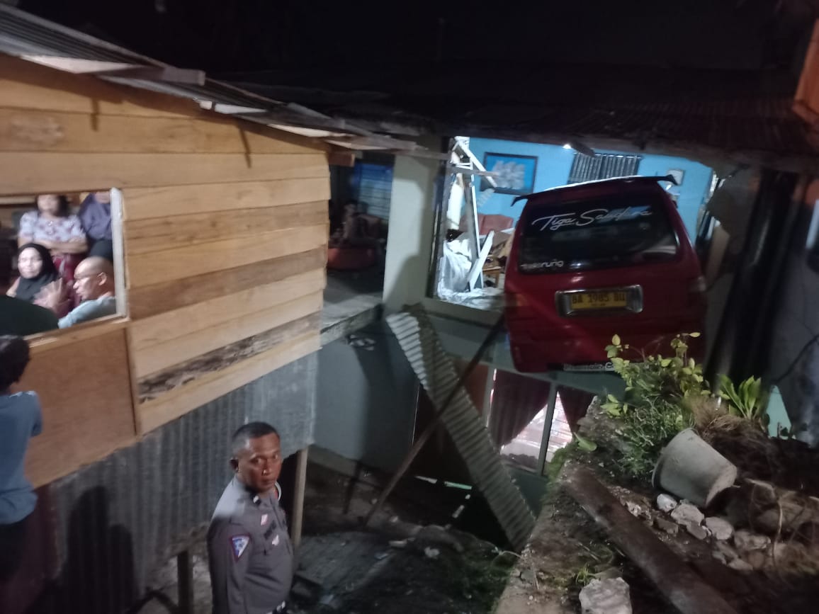 Mobil angkot dengan nomor polisi BA 1985 BU diduga mengalami rem blong saat menuruni jalan, hingga menabrak dua rumah warga.
