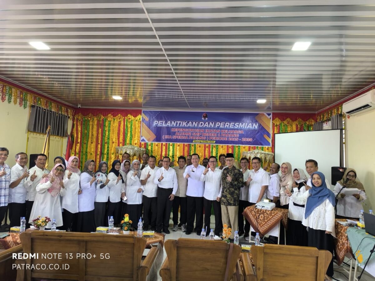 Kepengurusan Ikatan Keluarga Alumni SMPN 1 (Ikaspensa) Padang periode 2025 – 2030, berfoto bersama dengan Ketua Umum Laksamana Madya Edwin Latif SH. M.Han.MH., resmi dikukuhkan pada Jumat (23/5) di SMPN 1 Padang. IST
