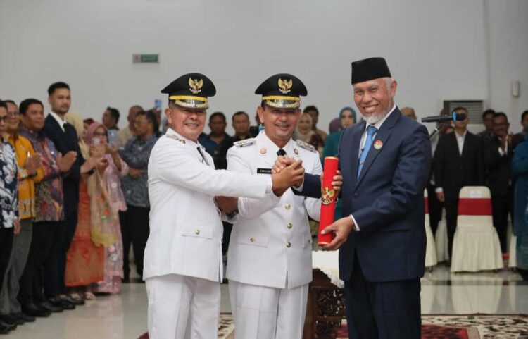 PADANG, HARIANHALUAN.IDโ Gubernur Sumatera Barat (Sumbar), Mahyeldi Ansharullah, resmi melantik Welly Suhery dan Parulian sebagai Bupati dan Wakil Bupati Pasaman periode 2025โ2030, Jumat (30/5/2025). Pelantikan berlangsung di Auditorium Gubernuran Sumbar, disaksikan sejumlah pejabat daerah dan tokoh masyarakat.