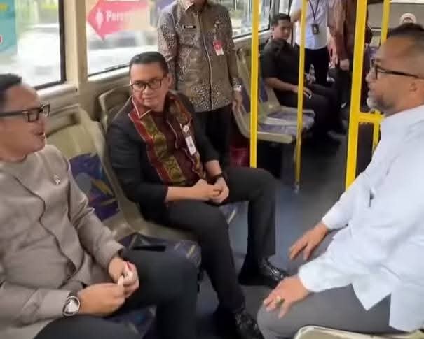 Dengan langkah cepat, Wamendagri menyusuri trotoar dan menaiki bus dari koridor utama. Di dalam bus, ia duduk di kursi belakang sopir dan menyapa ramah penumpang lainnya.