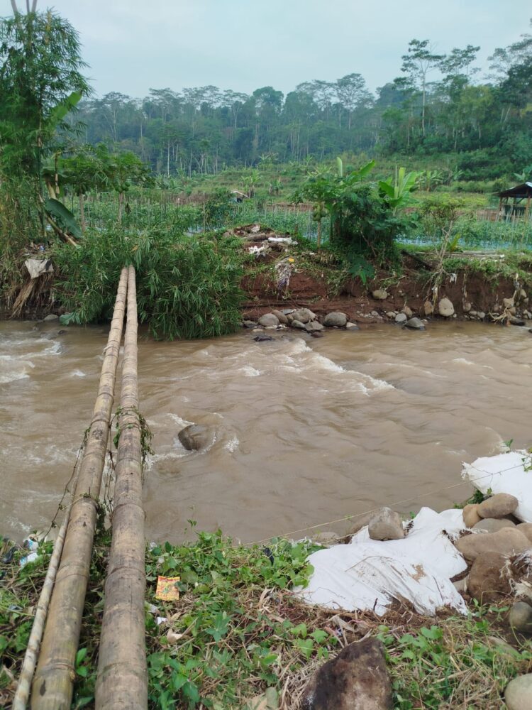 Debit air sungai meningkat signifikan akibat curah hujan ekstrem dan penyempitan aliran di beberapa titik, hingga meluap dan merendam enam bidang lahan sawah, terdiri dari satu lahan bengkok desa dan lima lahan milik petani.