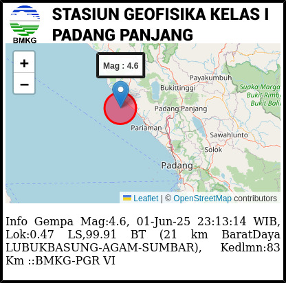 “18 kilometer Barat Daya Agam, Sumatera Barat. Kedalaman 83 kilometer,” tulisnya.