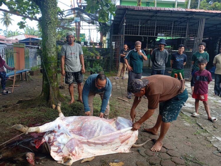 HARIAN HALUAN. ID – Keluarga besar Madrasah Aliyah Negeri (MAN) 1 Padang menyembelih dua ekor sapi kurban di madrasah tersebut, Senin (9/6/25).