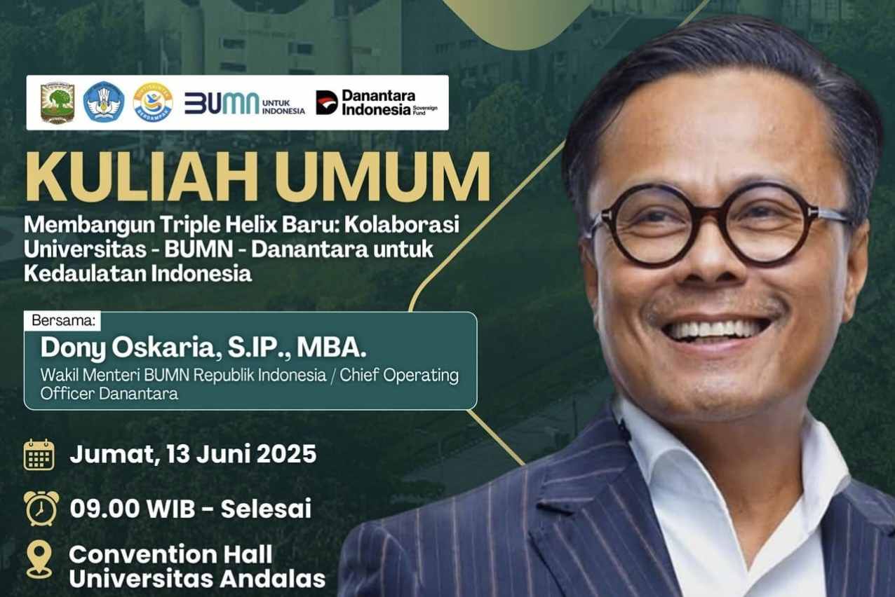 Wakil Menteri BUMN RI sekaligus Chief Operating Officer (COO) Danantara, Dony Oskaria, dijadwalkan hadir sebagai pembicara utama. Kuliah umum ini akan dibuka langsung oleh Rektor Universitas Andalas, Prof. Efa Yonnedi, Ph.D.