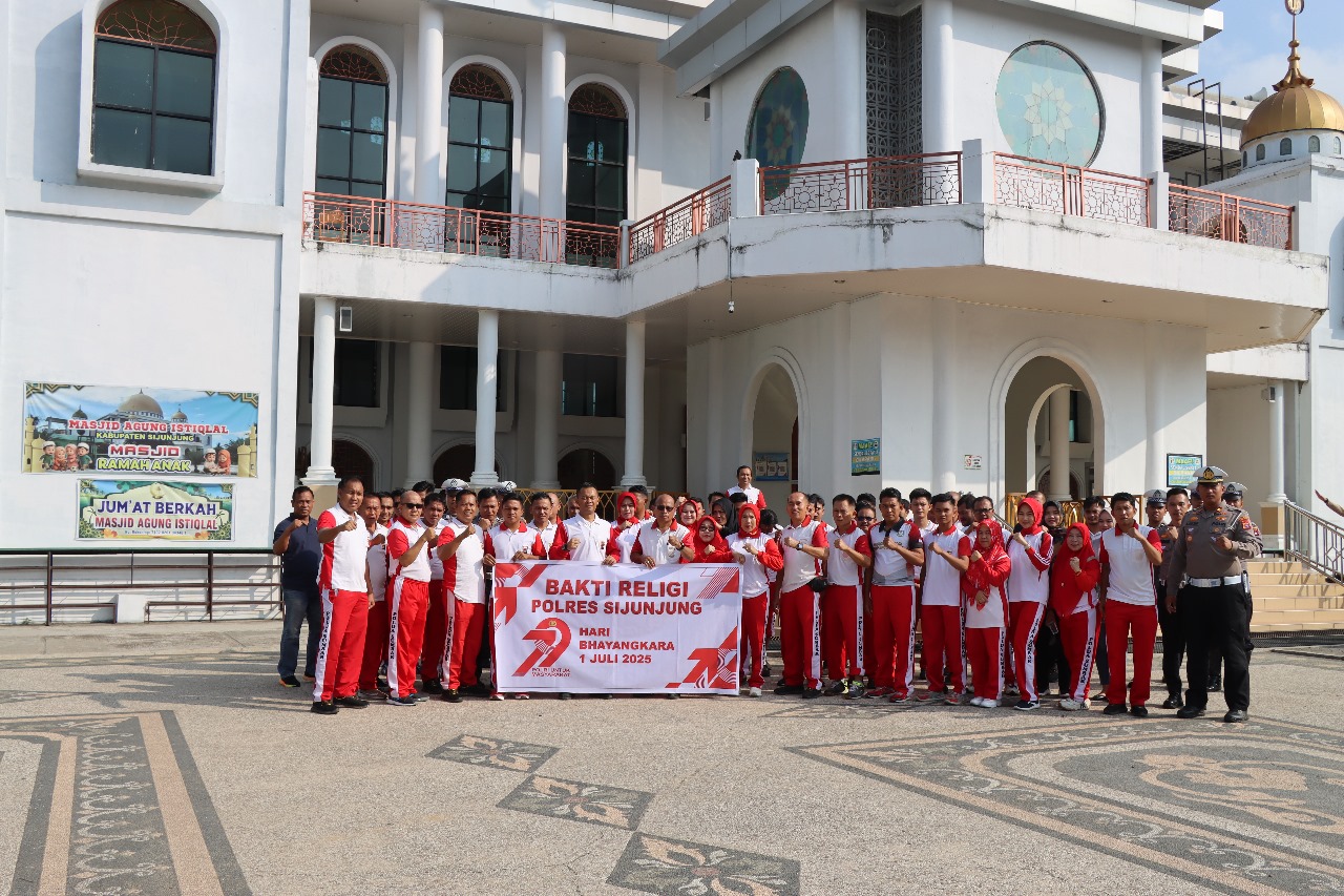 SIJUNJUNG,HARIANHALUAN.ID– Dalam rangka menyambut Hari Ulang Tahun (HUT) Bhayangkara ke-79, Polres Sijunjung menggelar kegiatan Bakti Religi sebagai wujud nyata kepedulian dan pengabdian Polri terhadap masyarakat serta lingkungan tempat ibadah, Jumat (15/6) di Mesjid Istiqlal Muaro Sijunjung. Kegiatan tersebut melibatkan seluruh personel Polres Sijunjung dan jajaran, dengan fokus kegiatan berupa pembersihan dan perawatan
