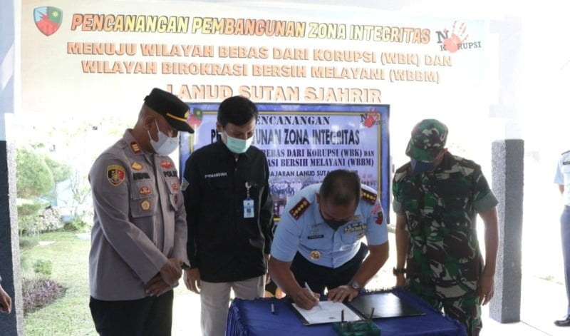 Pencanangan pembangunan Zona Integritas (ZI) menuju WBK dan WBBM di lingkungan Mako Lanud Sutan Sjahrir ini dikuatkan dengan penandatanganan pakta integritas oleh Danlanud Sutan Sjahrir, Kolonel Pnb Fahlevie, yang disaksikan oleh segenap Forkopimda yang hadir.