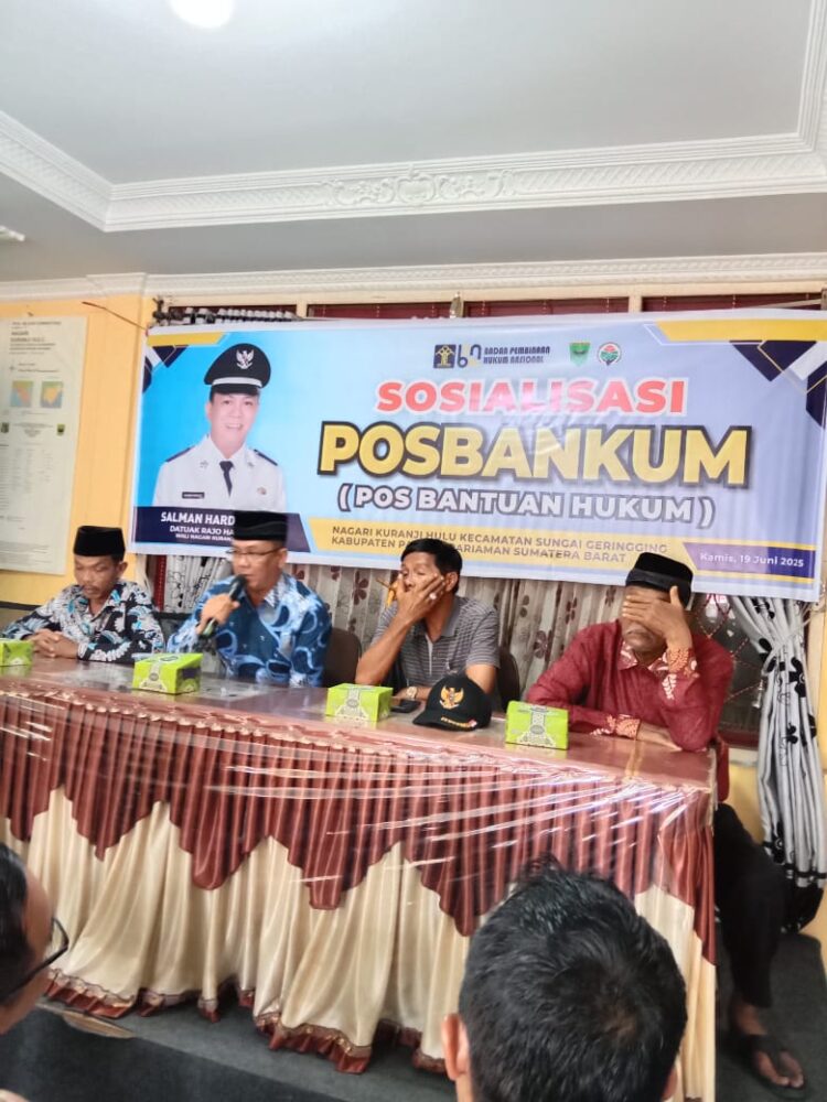 KURANJI HULU, HARIANHALUAN.ID — Pemerintah Nagari (Pemnag) Kuranji Hulu bersama Pos Bantuan Hukum (POSBAKUM) menggelar kegiatan sosialisasi pelayanan bantuan hukum gratis kepada tokoh masyarakat pada Rabu (19/6/25) di Aula Kantor Wali Nagari Kuranji Hulu. Kegiatan ini merupakan bagian dari pelaksanaan program Peacemaker Training yang bertujuan untuk memperluas akses keadilan di tingkat nagari.