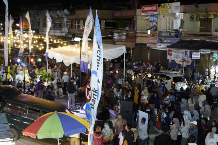 Sabtu malam (21/6/2025), masyarakat tampak memadati Simpang Empat Pasar Pusat. Mereka bersantai bersama keluarga, duduk di tikar-tikar yang disediakan di pinggir jalan, sambil menikmati alunan musik dan suasana malam yang meriah.