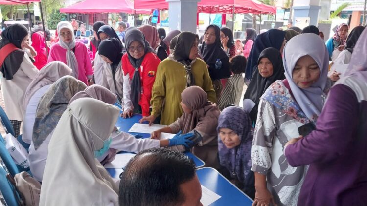 PADANG, HARIANHALUAN.ID— Warga Kecamatan Lubuk Begalung, Kota Padang, antusias mengikuti kegiatan cek kesehatan gratis (CKG) dan donor darah yang digelar dalam rangka memperingati Hari Narkotika Internasional (HANI) dan Hari Keluarga Nasional (Harganas) di halaman kantor Camat Lubuk Begalung, Rabu (25/6/2025).