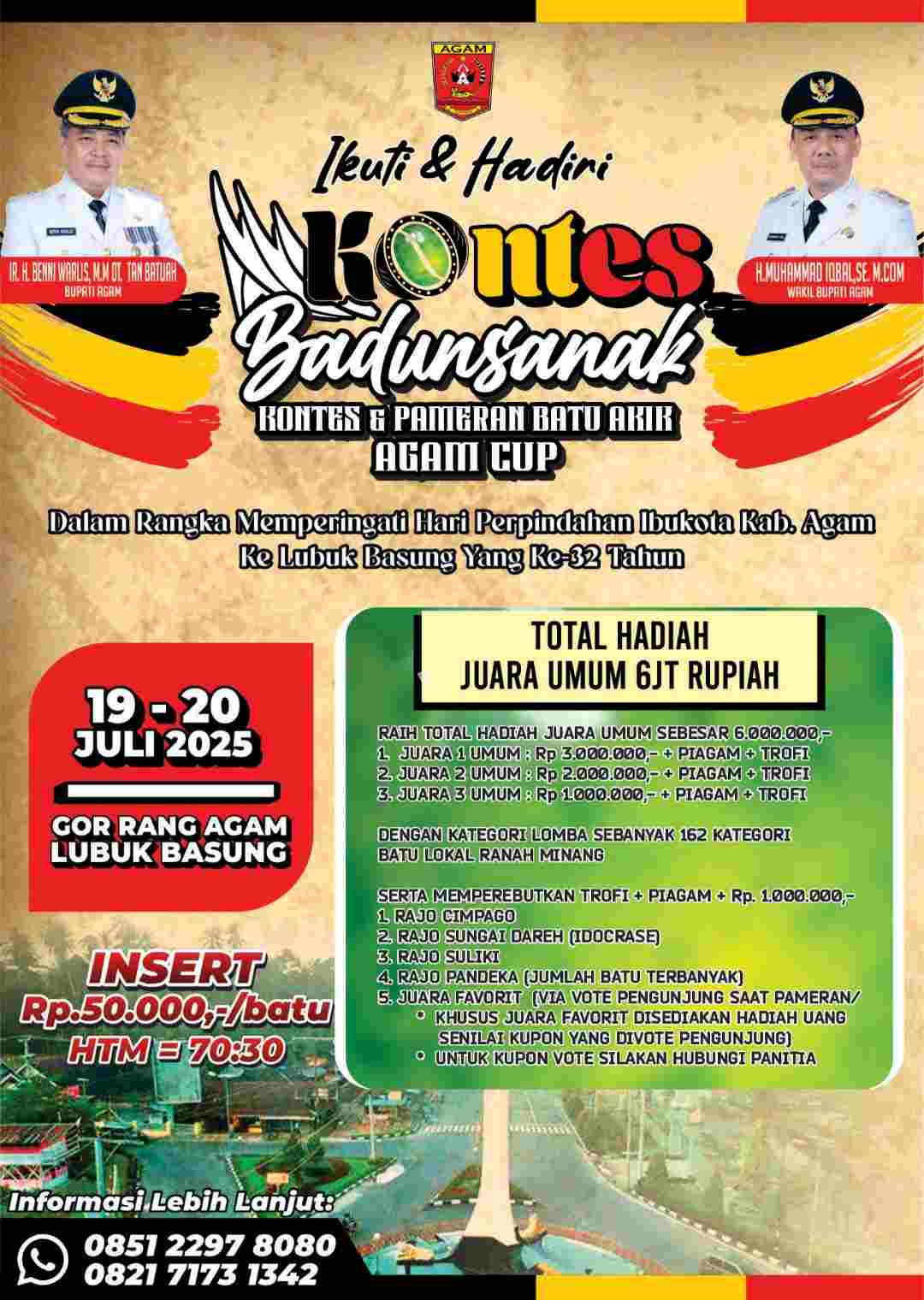 AGAM, HARIANHALUAN.ID โ€“ Dunia batu akik kembali bergeliat di Kabupaten Agam. Kontes dan Pameran Akik bertajuk Agam Cup akan digelar selama dua hari, pada 19โ€“20 Juli 2025, sebagai bagian dari peringatan hari perpindahan Ibu Kota Kabupaten Agam ke Lubuk Basung.