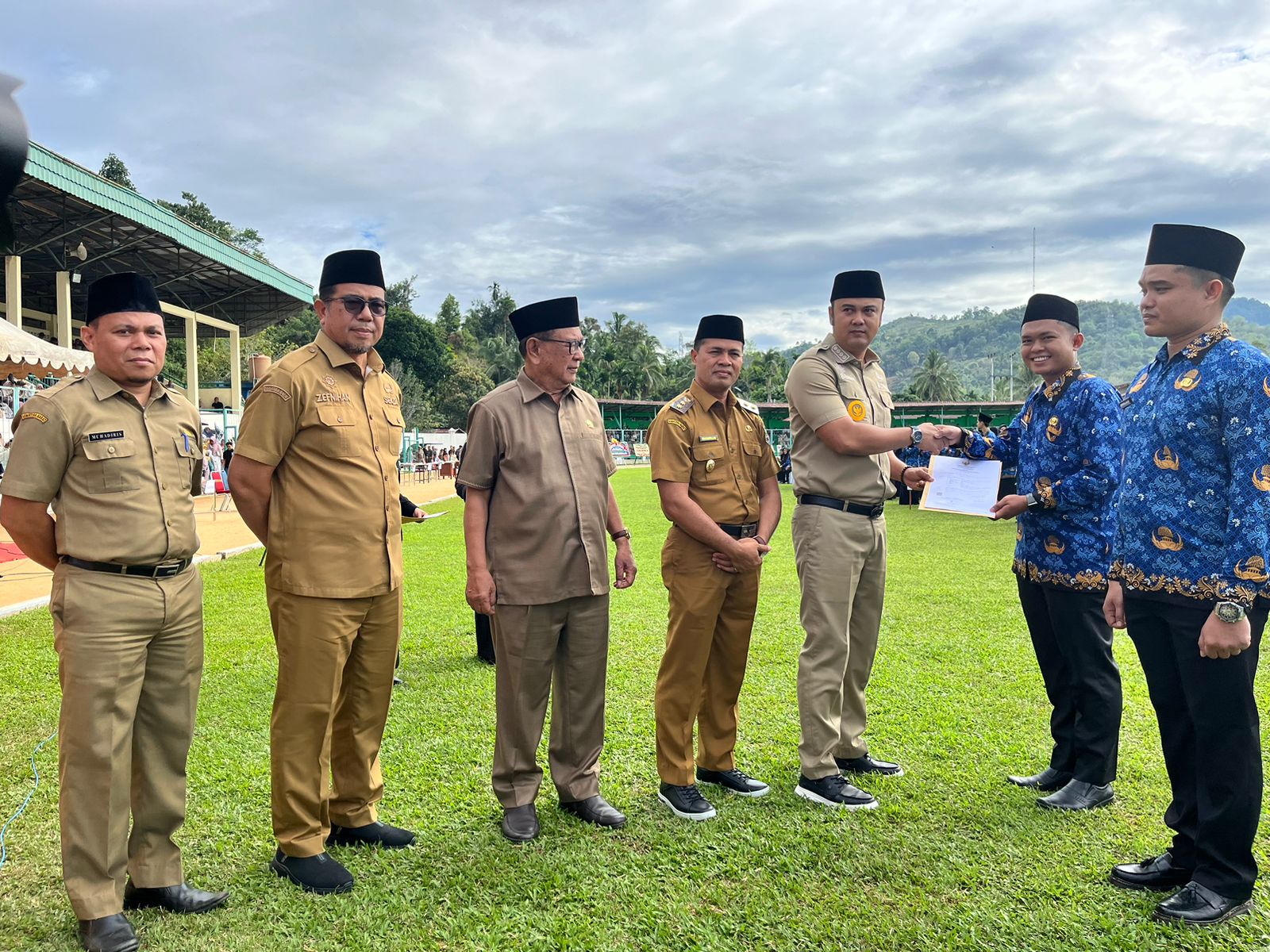 Keterangan Foto: Bupati Sijunjung Benny Dwifa didampingi Wakil Bupati Iraddatilah,Wakil Ketua DPRD Sijunjung Syaril Syamra, Sekretaris Daerah DR. Zefnihan dan Kepala BKPSDM Sijunjung menyerahkan secara Simbolis SK CPNS Formasi tahun 2024, Senin (14/7) di lapangan M Yamin Muaro Sijunjung. IST