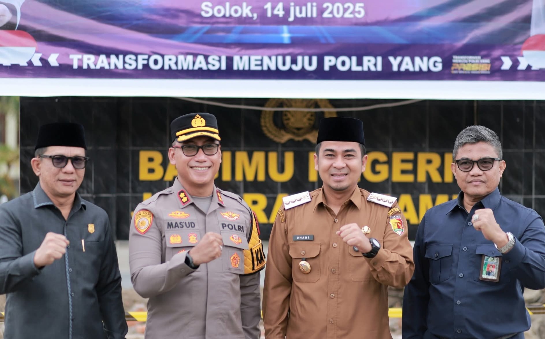 Teks Foto : Ketua DPRD Kota Solok Fauzi Rusli bersama Wali Kota Solok Ramadhani Kirana Putra, Kapolres Solok Kota AKBP Mas’ud Ahmad dan ketua Pengadilan Agama Solok selepas pelaksanaan apel Gelar Pasukan Operasi Patuh Singgalang 2025 di halaman Mapolres Solok Kota, Senin (14/7). Wandi Malin