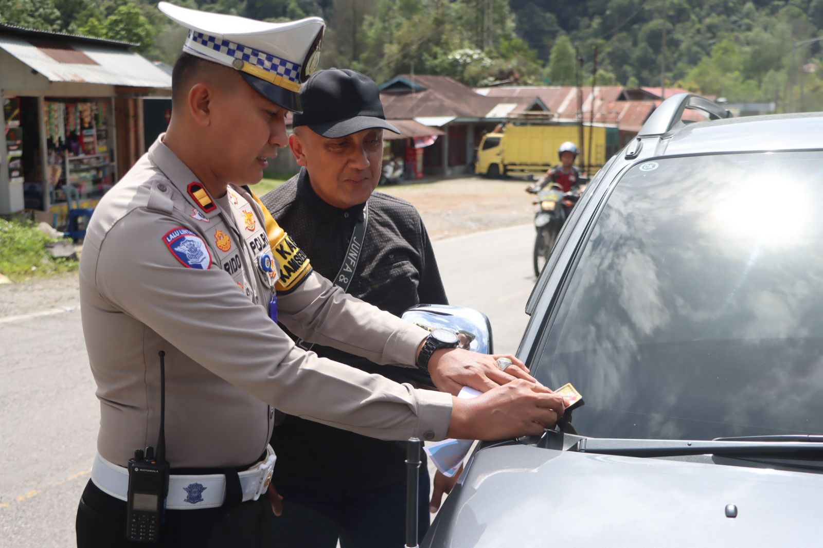 Selain memberikan edukasi, personel Sat Lantas Polres Solok juga melakukan pemasangan stiker Operasi Patuh Singgalang 2025 pada kendaraan-kendaraan yang telah menerima sosialisasi.