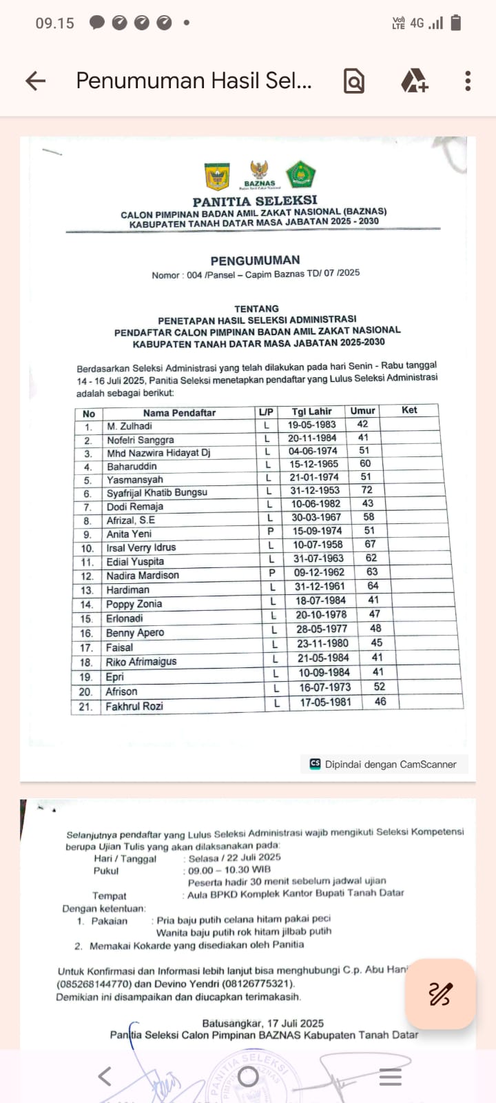 TANAH DATAR, HARIANHALUAN.ID – Panitia Seleksi Calon Pimpinan Badan Amil Zakat Nasional (Baznas) Kabupaten Tanah Datar resmi mengumumkan hasil seleksi administrasi pendaftaran calon pimpinan Baznas, melalui pengumuman Nomor: 004/Pansel-Capim Baznas TD/07/2025.
