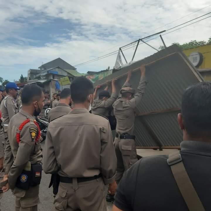HARIANHALUAN.id – Kembali Satpol PP tertibkan Lapak PKL di Jalan Aru, Depan Kampus UPI, Kecamatan Lubuk Begalung, Kota Padang, Sumatera Barat, Senin (20/6/2022).