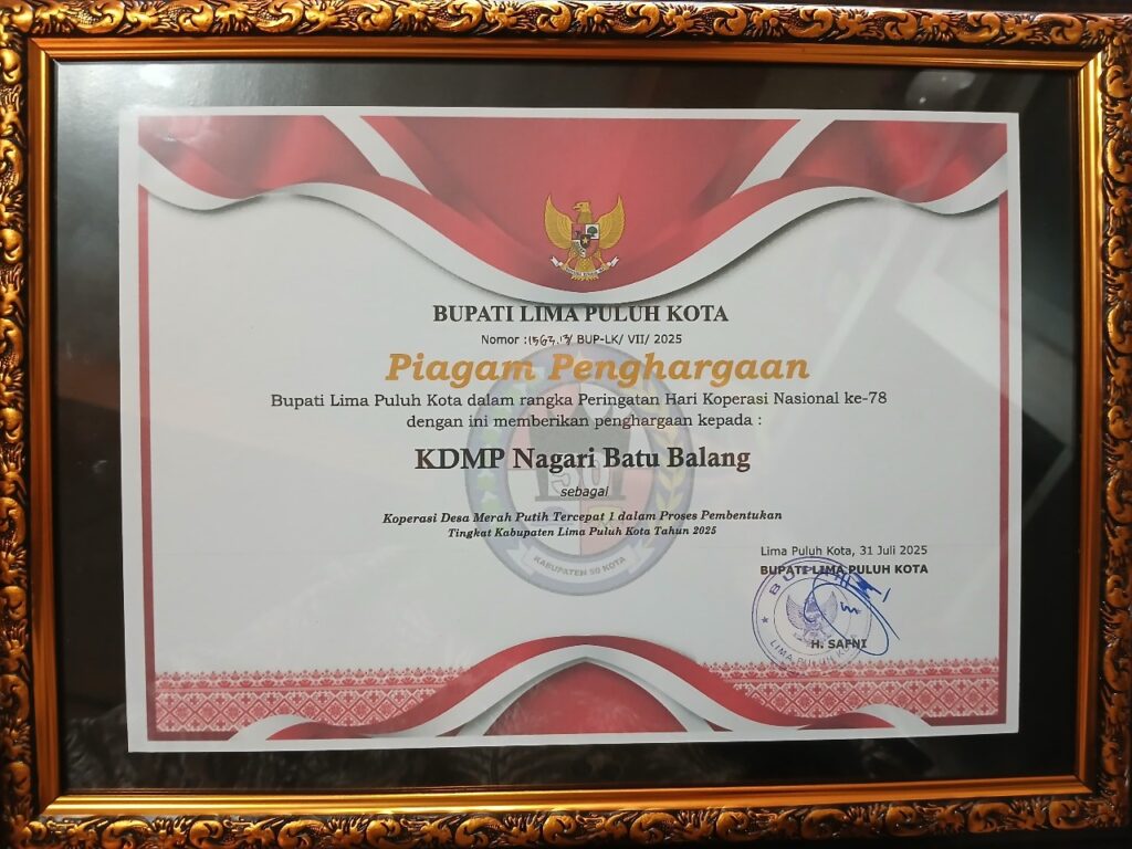 Penghargaan ini diberikan kepada koperasi yang dinilai paling cepat dalam proses pendirian sesuai arahan dari Kementerian Koperasi dan UKM melalui program Revitalisasi Ekonomi Desa. Dari seluruh nagari peserta, Koperasi Desa Merah Putih Batu Balang dinilai paling responsif dan memenuhi kriteria kelembagaan secara menyeluruh.