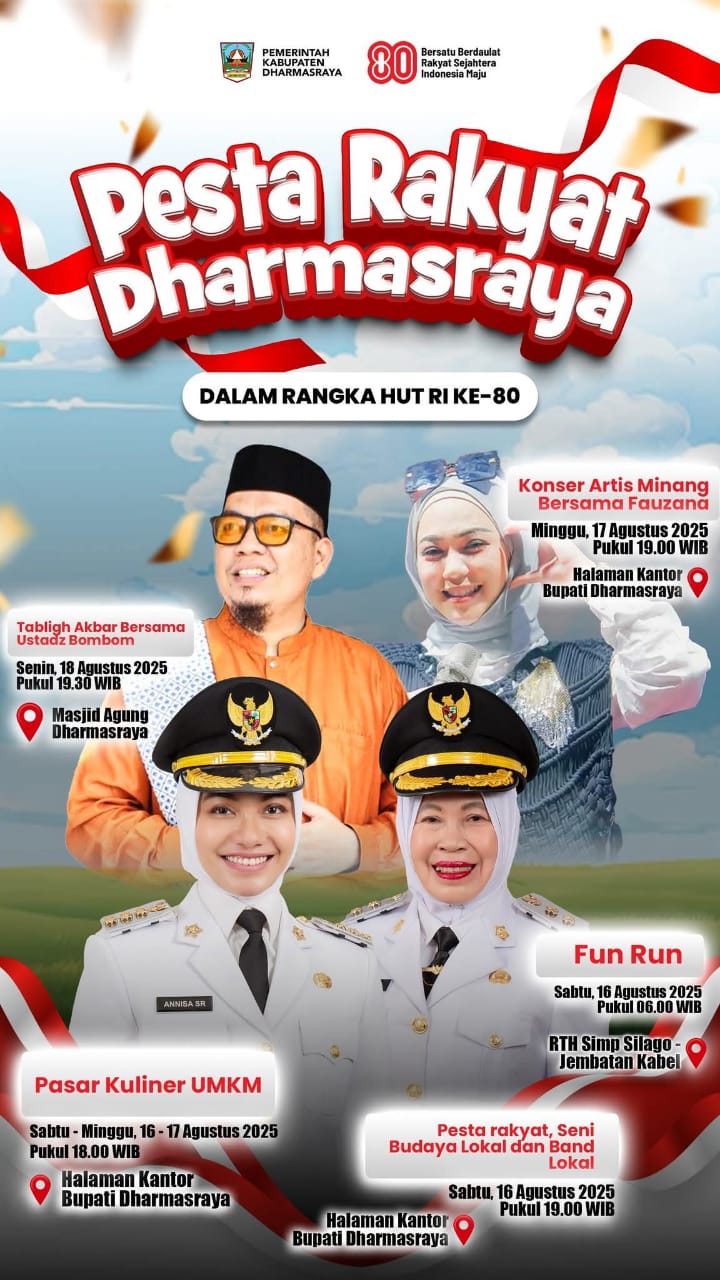 DHARMASRAYA, HARIANHALUAN.ID_ Pemerintah Kabupaten Dharmasraya, Sumatera Barat, menyiapkan rangkaian kegiatan dalam rangka memperingati Hari Ulang Tahun ke-80 Kemerdekaan Republik Indonesia dengan konsep meriah namun efisien, yang turut melibatkan pelaku UMKM lokal dan dukungan sponsor swasta, BUMD dan BUMN.