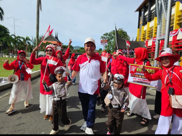 HARIANHALUAN. ID – Sekitar tiga ribuan murid Raudhatul Athfal (RA) an Taman Kanak-kanak se- Kota Padang dengan penuh keceriaan, kegembiraan dan semangat ramaikan Pawai Kerukunan murid RA dan TK dalam rangka semarak Hari Ulang Tahun (HUT) Kemerdekaan RI ke-80 tingkat Kota Padang di halaman Kantor Gubernur Sumbar, Sabtu (16/8/25).