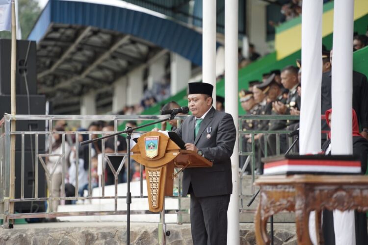 HARIANHALUAN. ID – Kepala Kantor Kementerian Agama (Kakankemenag) Kabupaten Solok Selatan (Solsel) , Fitriyoni bertindak selaku pembaca doa pada upacara peringatan Hari Ulang Tahun (HUT) ke-80 Kemerdekaan Republik Indonesia tingkat Kabupaten Solsel di lapangan Rimbo Tangah Nagari Lubuak Gadang Kecamatan Sangir Minggu (17/8/25).