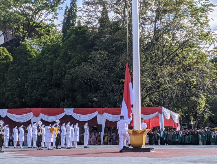 PADANG, HARIANHALUAN. ID— Universitas Andalas (UNAND) menggelar upacara pengibaran bendera merah putih untuk memperingati Hari Ulang Tahun (HUT) ke-80 Republik Indonesia di lapangan upacara Kampus UNAND pada Minggu (17/8/25). Upacara berlangsung khidmat dengan dihadiri sivitas akademika, mahasiswa internasional, hingga tamu akademisi dari luar negeri.