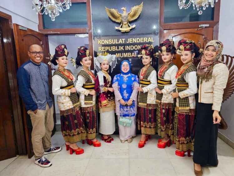 Keterangan Foto: Ketua TP PKK Sijunjung Nedia Guspardi Benny Dwifa diapit anggota Sanggar Pusako Panai Sijunjung yang berhasil memukau publik di India dengan penampilan tarian tradisional Minangkabau yang memukau dalam acara puncak Jakarta – Mumbai (JaMu) di ICM Chamber of Industry Commerce, Mumbai India.