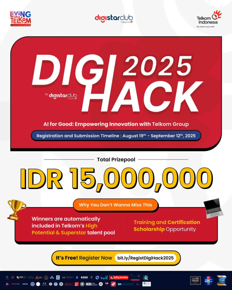 Pendaftaran DigiHack 2025 telah resmi dibuka mulai 19 Agustus hingga 12 September 2025. Seluruh calon peserta dapat melakukan pendaftaran melalui tautan bit.ly/RegistDigiHack2025.