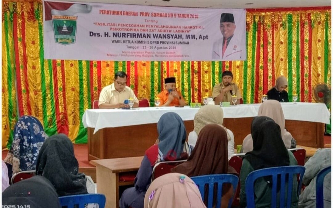 SOLSEL, HARIANHALUAN.ID – Wakil Ketua Komisi V Dewan Perwakilan Rakyat Daerah (DPRD) Provinsi Sumatera Barat, Drs. H. Nurfirman Wansyah, A.Pt., MM, melaksanakan sosialisasi Peraturan Daerah Provinsi Sumatera Barat Nomor 9 Tahun 2018 tentang Fasilitasi Pencegahan Penyalahgunaan Narkotika, Psikotropika, dan Zat Adiktif (NAPZA) di Wisma Umi Kalsum, Kecamatan Sungai Pagu, Kabupaten Solok Selatan, Senin (25/8/2025).