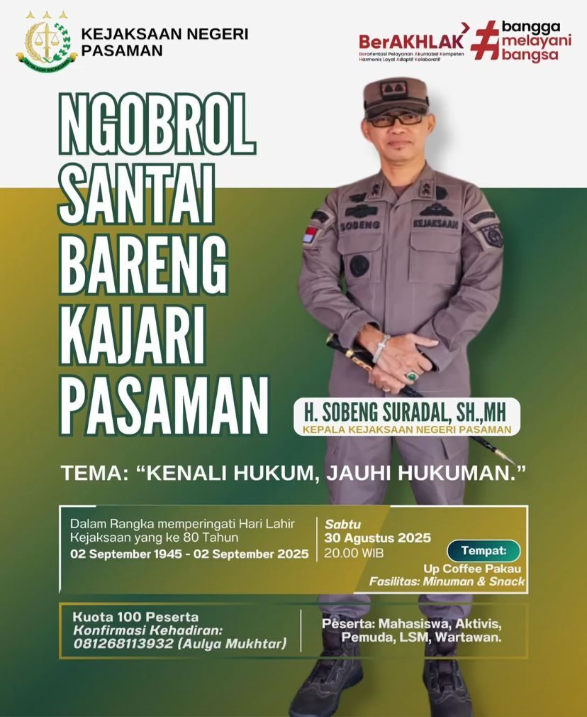 PASAMAN, HARIANHALUAN.ID — Menyambut Hari Ulang Tahun (HUT) Kejaksaan ke-80 Kejaksaan Negeri (Kejari) Pasaman gelar acara ngobrol santai bareng Kajari Pasaman dengan tema Kenali Hukum, Jauhi Hukuman.