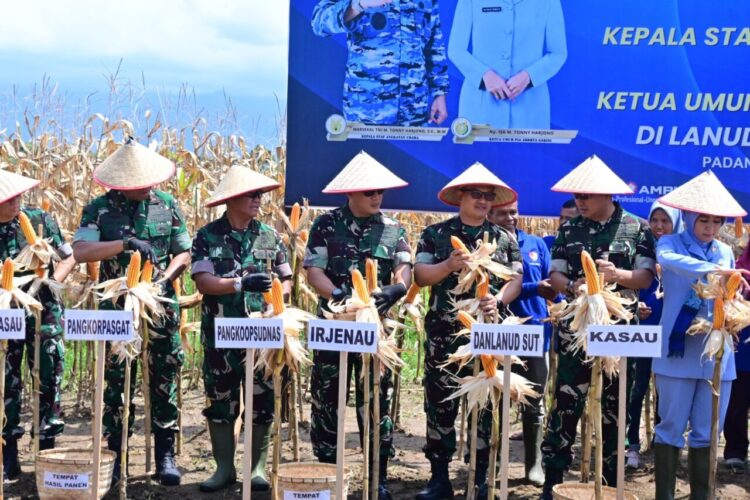 Kasau bersama Ketua Umum Pia Ardhya Garini menyerahkan secara simbolis bibit jagung dan paket sembako kepada para petani binaan. Sekaligus melaksanakan panen jagung bersama di area ketahanan pangan Lanud Sutan Sjahrir.
