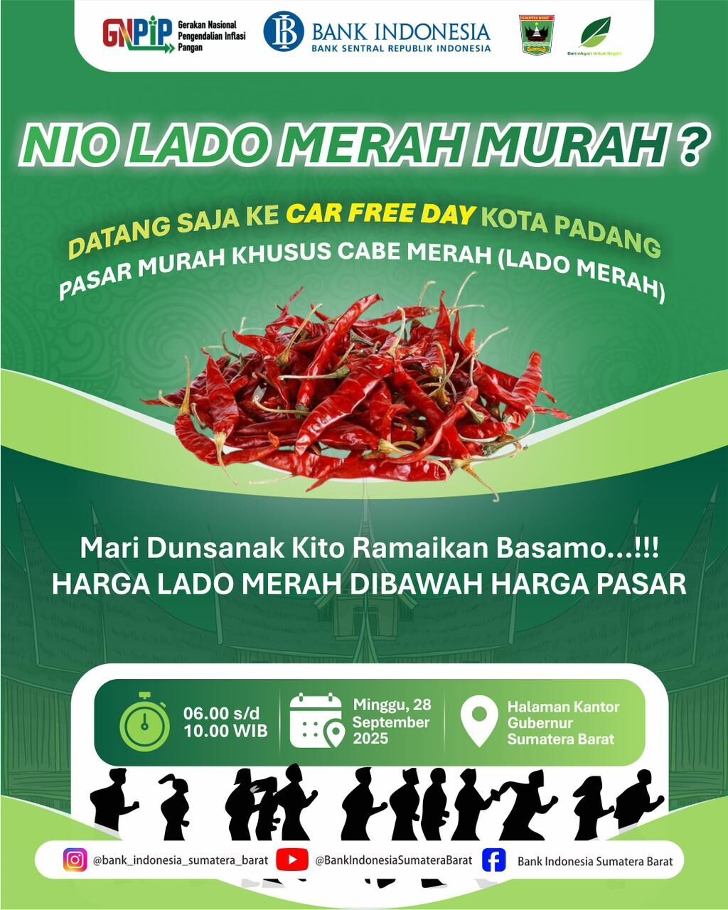 Bagi masyarakat Kota Padang yang ingin membeli cabai merah dengan harga di bawah harga pasar segera buru dan ramaikan yang diselenggarakan oleh Bank Indonesia (BI) Sumbar yang disupport oleh Pemerintah daerah.