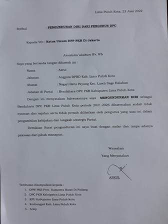 Dalam surat itu juga dijelaskan bahwa Asrul saat ini tercatat sebagai anggota DPRD Lima Puluh Kota periode 2019-2024 mengajukan pengunduran diri sebagai bendahara DPC Lima Puluh Kota periode 2021-2026. Surat itu juga lengkap dengan tandatangan Asrul.