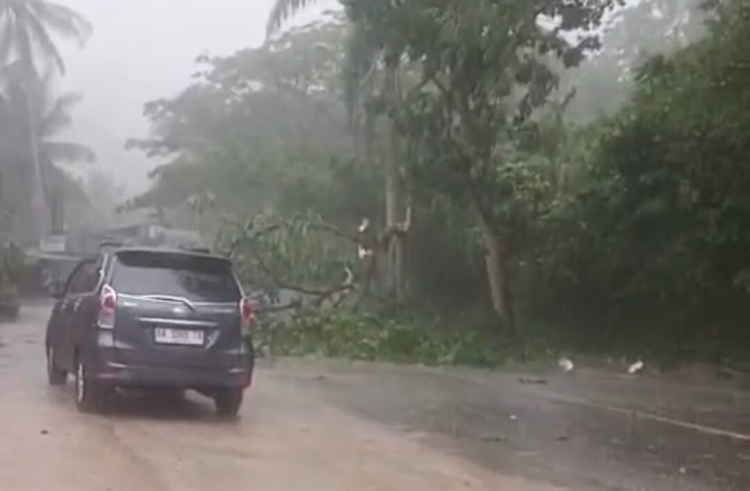 SAWAHLUNTO, HARIANHALUAN.ID – Hujan lebat disertai badai sekitar pukul 15.30 WIB, Kamis (2/10/2025), melanda Dusun Kebun Jeruk, Desa Silungkang Oso, Kota Sawahlunto. Satu pohon sengon tumbang menimpa badan jalan dan membuat arus Jalur Lintas Sumatera di kawasan itu sempat tersendat.