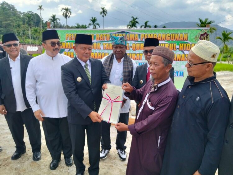 Bertempat di Kubang, Jorong II, digelar kegiatan Peletakan Batu Pertama Pembangunan Mushalla Pondok Tahfiz Al-Qur’an Nurul Hidayah sekaligus penyerahan sertifikat wakaf tanah dari Kepala Badan Pertanahan Nasional (BPN) Kabupaten Pasaman kepada Pimpinan Pondok Tahfiz Al-Qur’an Nurul Hidayah.