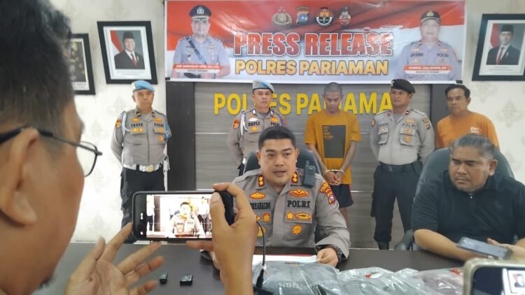 Keterangan foto: Kapolres Pariaman AKBP Andreanaldo Ademi didampingi Kasat Reskrim Pariaman Iptu Rio Ramadhani saat rilis kasus di mapolres.