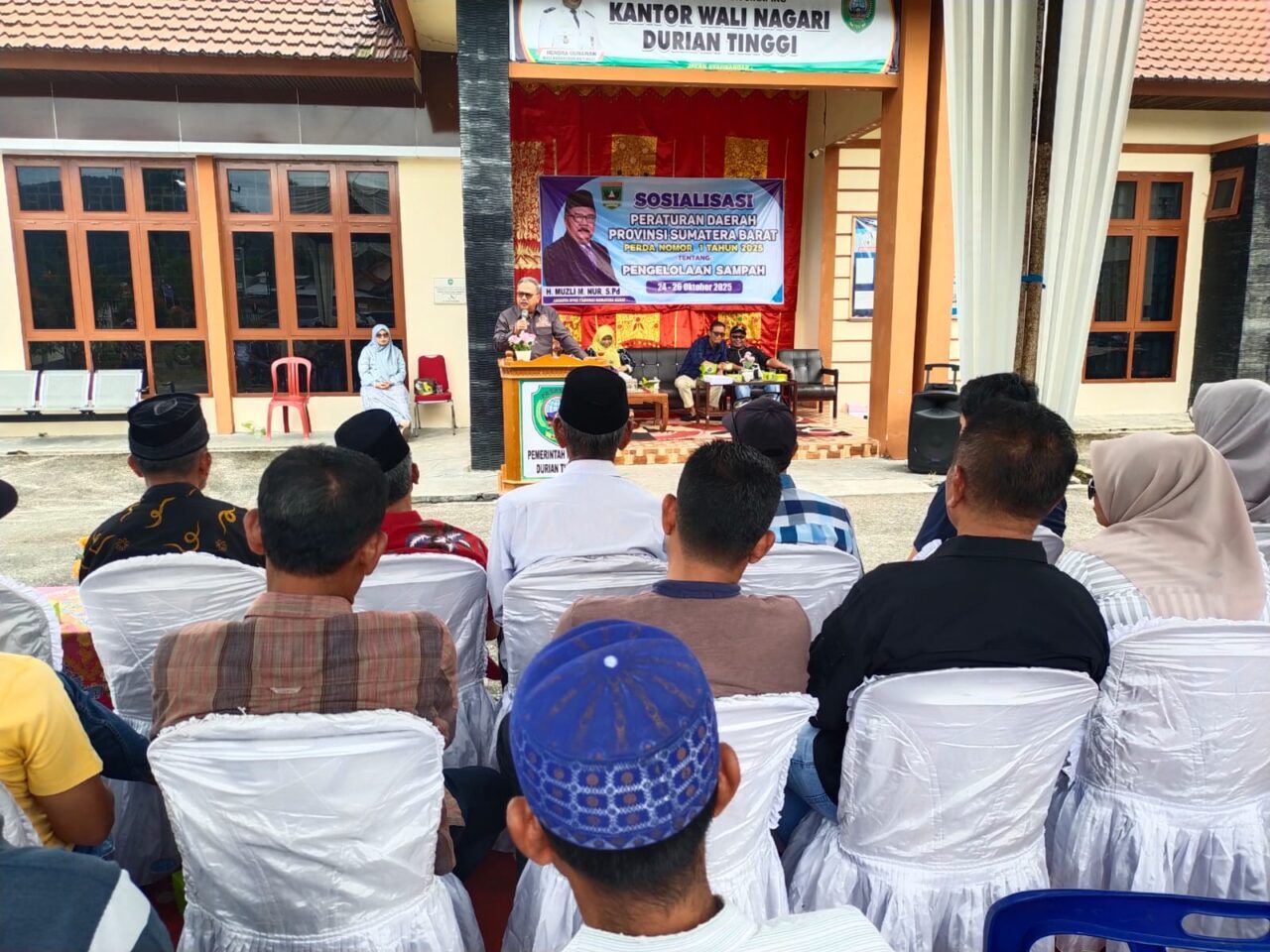 PASAMAN, HARIANHALUAN.ID — Anggota DPRD Provinsi Sumatera Barat H. Muzli M. Nur menggelar sosialisasi Peraturan Daerah Provinsi Sumatera Barat Nomor 1 Tahun 2025 tentang Pengelolaan Sampah di halaman Kantor Wali Nagari Durian Tinggi, Kecamatan Lubuk Sikaping, Sabtu (25/10/2025).