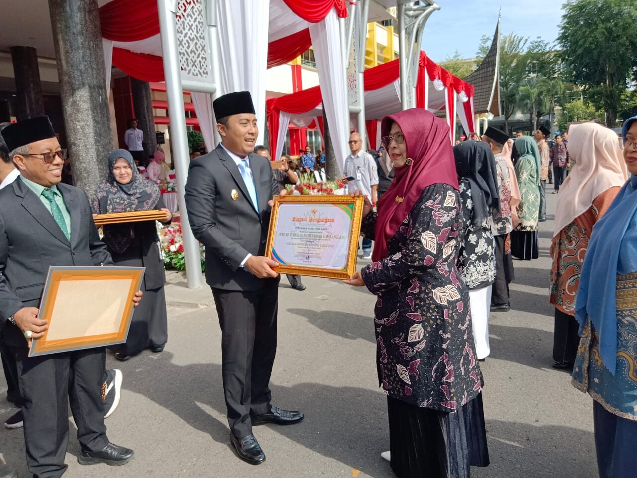 Usai upacara, Wakil Gubernur Sumatera Barat Vasko Ruseimy menyerahkan penghargaan kepada para pemenang Lomba Nagari/Desa/Kelurahan Bersih Sampah dan Sekolah Adiwiyata Provinsi Sumatera Barat Tahun 2025 yang digagas oleh Dinas Lingkungan Hidup (DLH) Sumbar.