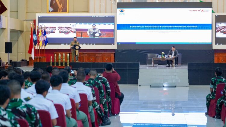 BOGOR, HARIANHALUAN.ID – Kepala Badan Nasional Penanggulangan Bencana (BNPB) Letjen TNI Dr. Suharyanto, S. Sos, M.M., memberikan pemaparan terkait penanggulangan bencana di hadapan ratusan Kadet atau mahasiswa Universitas Pertahanan di Aula Merah Putih, Kampus Bela Negara Universitas Pertahanan, Kabupaten Bogor, Jawa Barat pada Jumat (7/11).