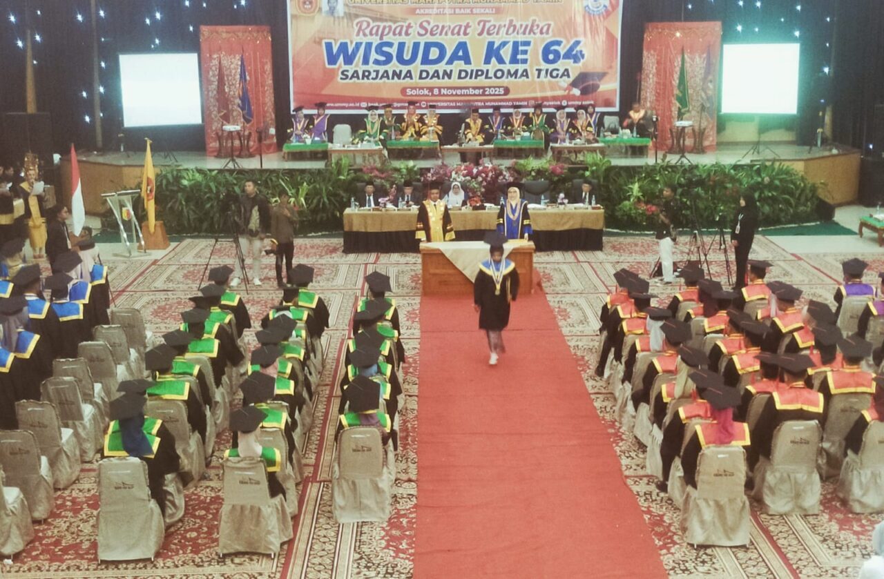SOLOK KOTA, HARIANHALUAN.ID — Universitas Mahaputra Muhammad Yamin (UMMY) Solok kembali mewisuda sebanyak 146 lulusan, pada Rapat Senat Terbuka Wisuda ke-64 program sarjana dan diploma tiga yang digelar di Gedung Kubuang Tigo Baleh, Kota Solok, Sabtu (8/11/2025).