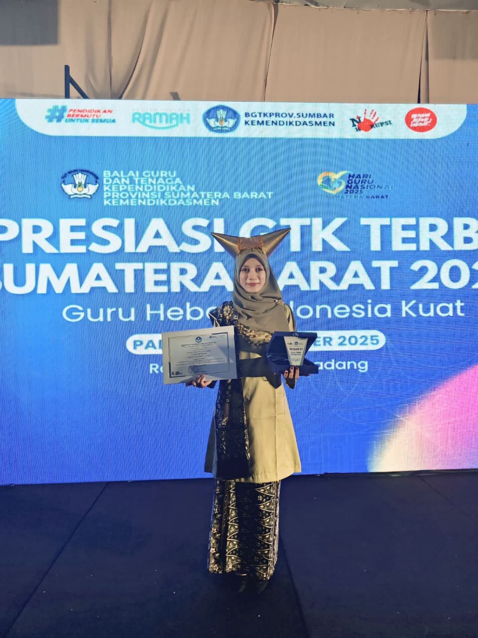 Pengumuman sekaligus penyerahan penghargaan dilaksanakan di Rocky Hotel Padang, Jumat (7/11/2025). Ajang tahunan tersebut merupakan bentuk penghargaan bagi para guru dan tenaga kependidikan yang menunjukkan dedikasi, inovasi, dan transformasi nyata dalam dunia pendidikan. Melalui inovasi bertajuk “MENULARI-GOS”, Yona sukses menyisihkan banyak pesaing dari berbagai kabupaten dan kota di Sumatera Barat.