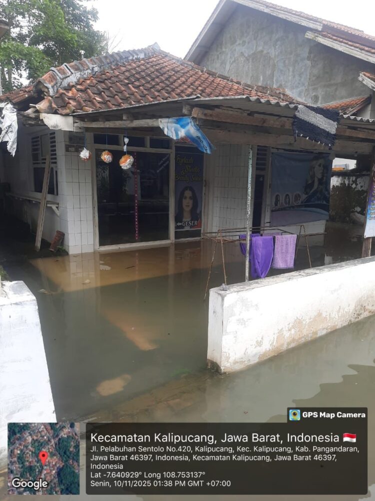 Di Kabupaten Pangandaran, banjir terjadi pada Selasa (11/11) sekitar pukul 09.00 WIB, setelah hujan dengan intensitas tinggi mengguyur wilayah tersebut sejak dini hari. Curah hujan menyebabkan debit air sungai meningkat dan meluap ke permukiman warga di beberapa desa.