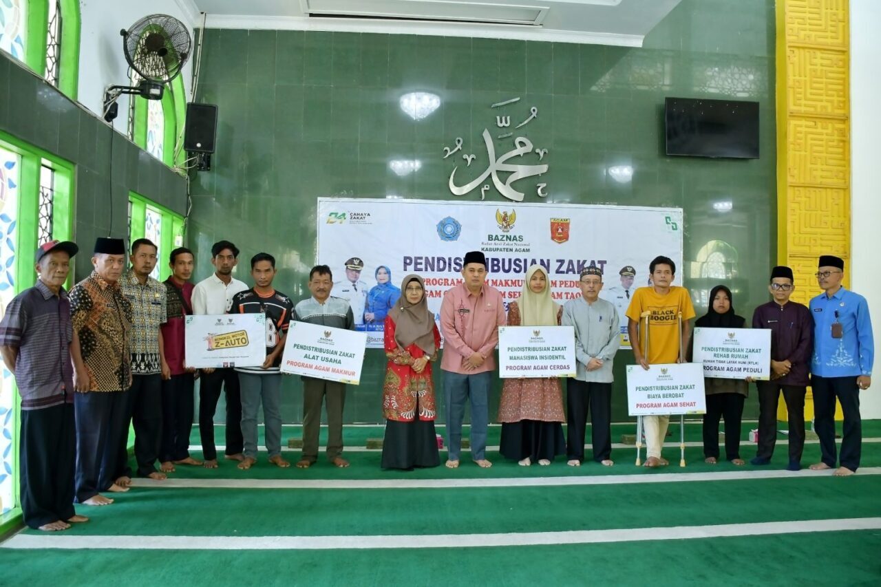 Pendistribusian zakat secara simbolis dilakukan Staf Ahli Bupati Bidang Hukum Politik dan Pemerintahan, Dandi Pribadi, Ketua Baznas Agam, Isman Imran dan lainnya.