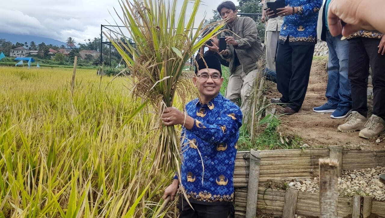 Teks Foto – Wakil Rektor (WR) I UIN Bukittinggi, Afrinaldi melaksanakan panen perdana padi Kuriak Kusuik menggunakan pupuk organik cair Herdanic di Dusun Halalang, Jorong Kambing VII, Nagari Gaduik, Kecamatan Tilatang Kamang, Kabupaten Agam. YURSIL.