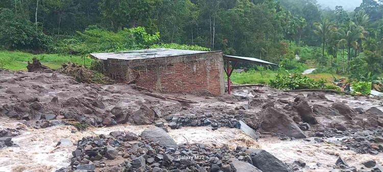 Banjir bandang tersebut membawa material kayu dan batu berukuran besar sehingga menimbulkan kerusakan cukup parah.