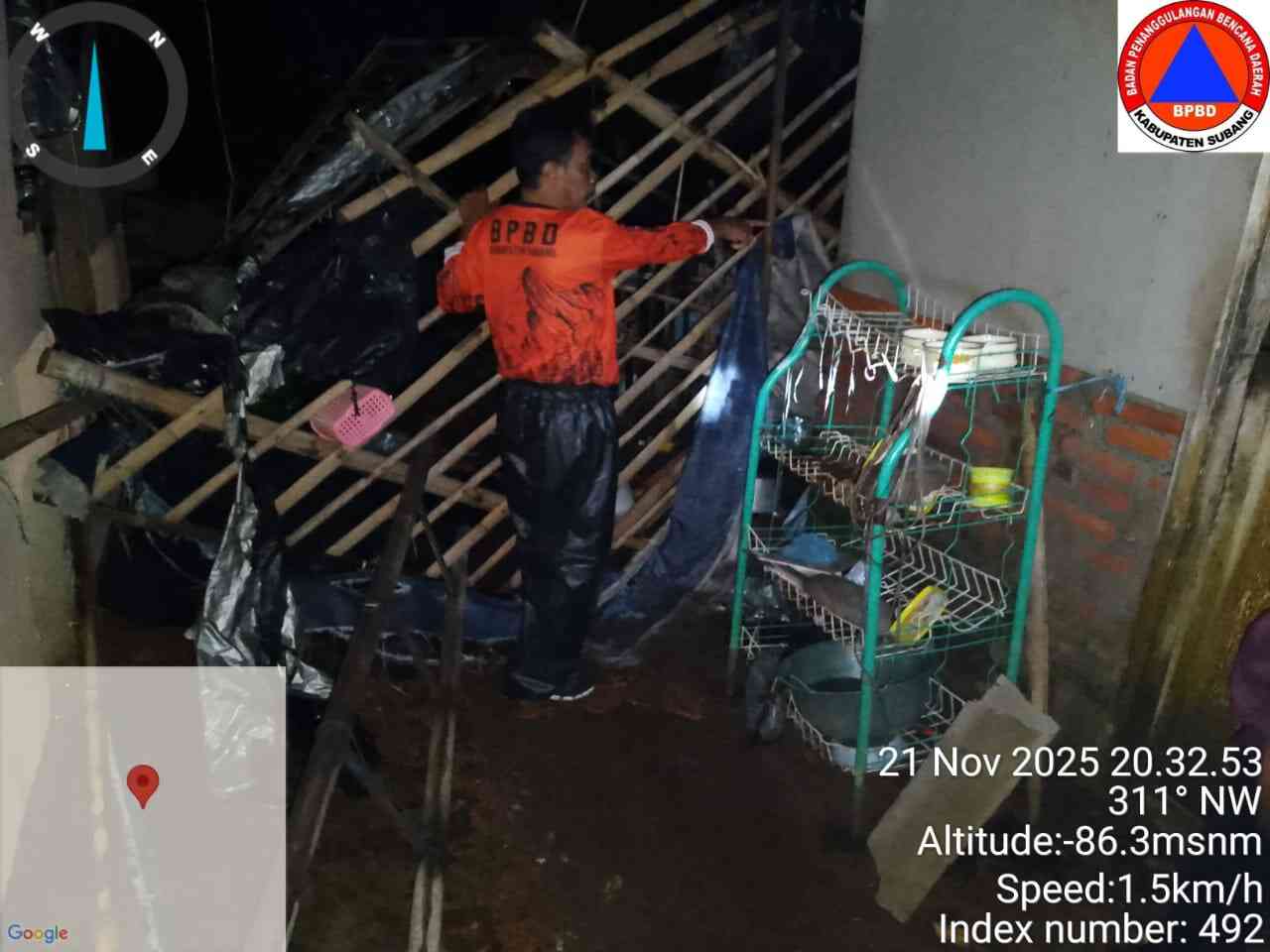 Sementara itu, dari Kabupaten Subang dilaporkan hujan deras disertai angin kencang mengakibatkan beberapa rumah warga Desa Muara dan Desa Tanjung Tiga di Kecamatan Blanakan rusak. Peristwa ini terjadi pada Jumat (21/11). Rincian rumah rusak antara lain lima unit rumah rusak sedang dan 17 unit rumah rusak ringan. Total 22 Kepala Keluarga (KK) terdampak peristiwa ini.