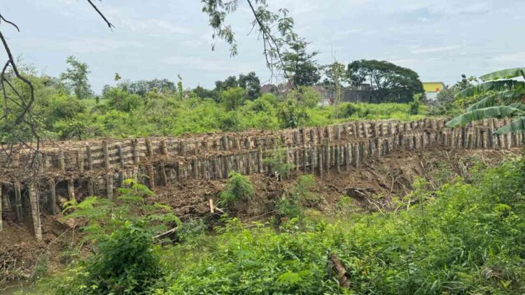 Pembangunan talud darurat dilakukan dengan menggunakan cerucuk bambu dan kantong pasir. Tak kurang dari 2.196 batang bambu terbaik dengan panjang empat meter digunakan sebagai benteng penahan talud. Kemudian agar talud lebih aman dari resapan air, 205 lembar anyaman bambu digunakan sebagai lapisan. Talud darurat ini turut diperkuat dengan 1.250 kantong pasir untuk menahan debit air sungai.