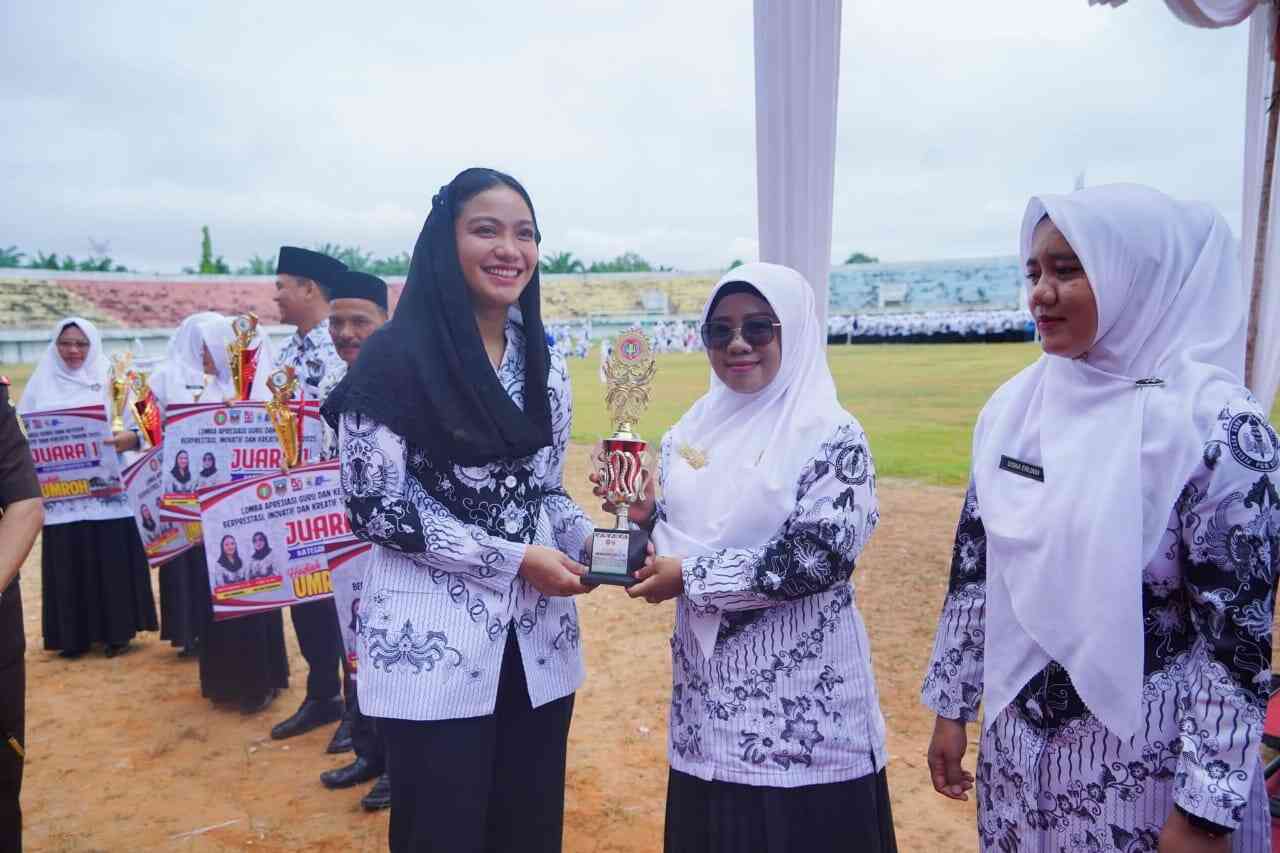 DHARMASRAYA, HARIANHALUAN.ID — Suasana haru dan bahagia menyelimuti Stadion Sport Center Dharmasraya, Selasa (25/11/2025). Di hadapan ribuan peserta upacara peringatan Hari Guru Nasional dan HUT ke-80 PGRI, Bupati Annisa Suci Ramadhani dan Wakil Bupati Leli Arni secara khusus menyerahkan hadiah istimewa berupa umrah kepada para guru dan kepala sekolah terbaik Kabupaten Dharmasraya.