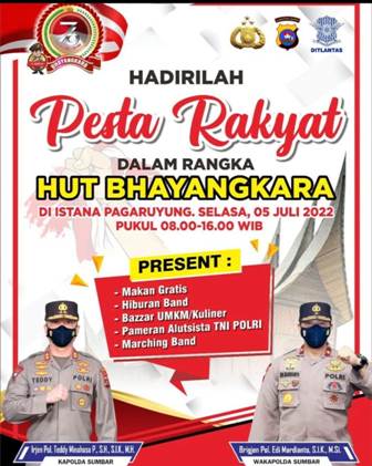 “Iya, ada pesta rakyat dalam rangka memperingati Hari Bhayangkara ke-76. Kegiatannya ada makan gratis, hiburan band, bazzar UMKM kuliner, pameran alutsista TNI Polri dan marching band,” kata Kabid Humas Polda Sumbar, Kombes Pol Satake Bayu Setianto, Senin (4/7/2022) di Mapolda Sumbar.